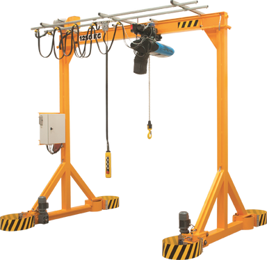 Motorized gantry crane for indoor use. Options for outdoor use. Use on smooth and clean concrete floor. Max slope 2%. Welded construction. 2 Motor...