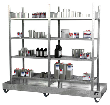 Safe storage of canisters/small cansAttributes Basic shelf plus extension, each 4 levels (2x4 galvanized spill trays) + hot-dip galvanized sump tra...