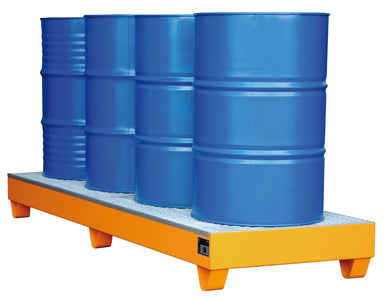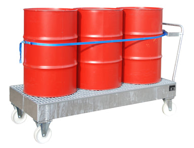 Mobile storage of 200 litre drumsAttributes Construction made of 3 mm steel sheet Galvanized grid (load capacity 1000 kg/m²) 2 swivel + 2 fixed pol...